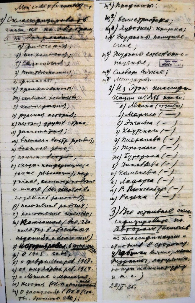 Сохранилась инструкция по составлению библиотеки, написанная рукой Иосифа Виссарионовича 29 мая 1925 года.