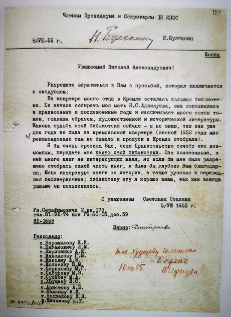 Особенно много читала Света. Она выросла на книгах из этой библиотеки. После смерти отца Светлана обратилась к Хрущёву с просьбой продолжать пользоваться библиотекой:
