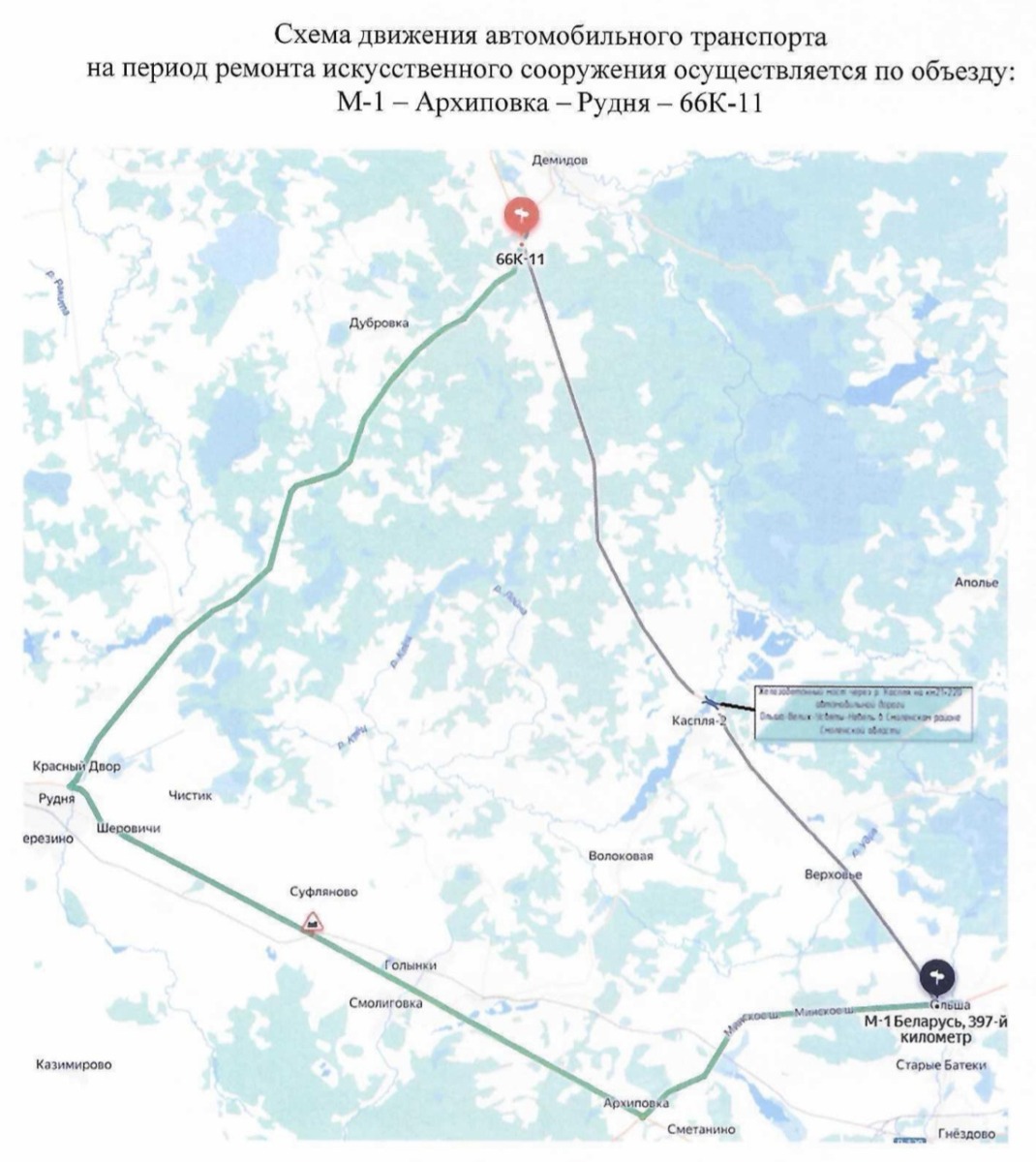 С 12 мая начинается ремонт моста через реку Касплю. На время проведения работ движение транспортных средств по дорожному сооружению будет запрещено. Соответствующий приказ подписал министр транспорта и дорожного хозяйства Смоленской области Роман Бондаренко.